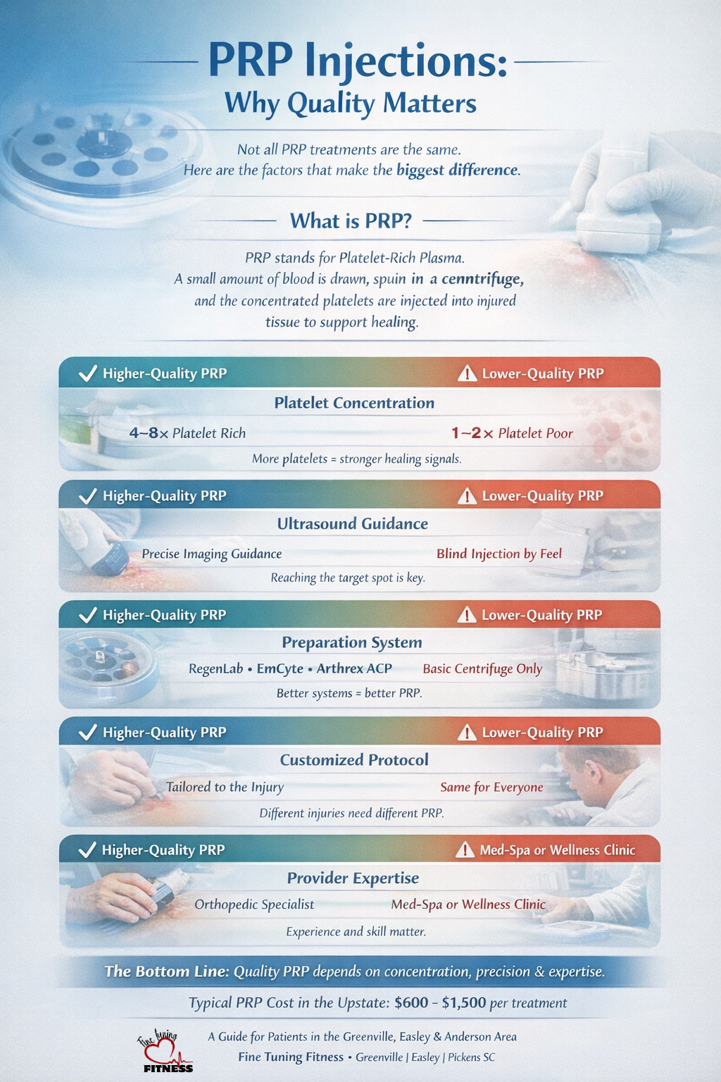 If you live in the Upstate — Greenville, Easley, Pickens, Anderson, or Six Mile — here’s the straight story on what PRP is, what it costs locally, why ultrasound-guided high-concentration PRP matters, and what questions to ask before letting anyone stick a needle in your joint.